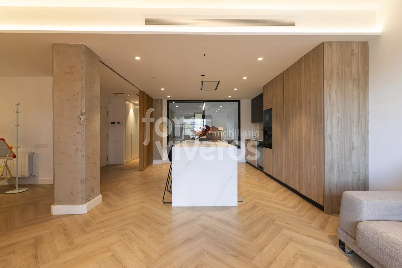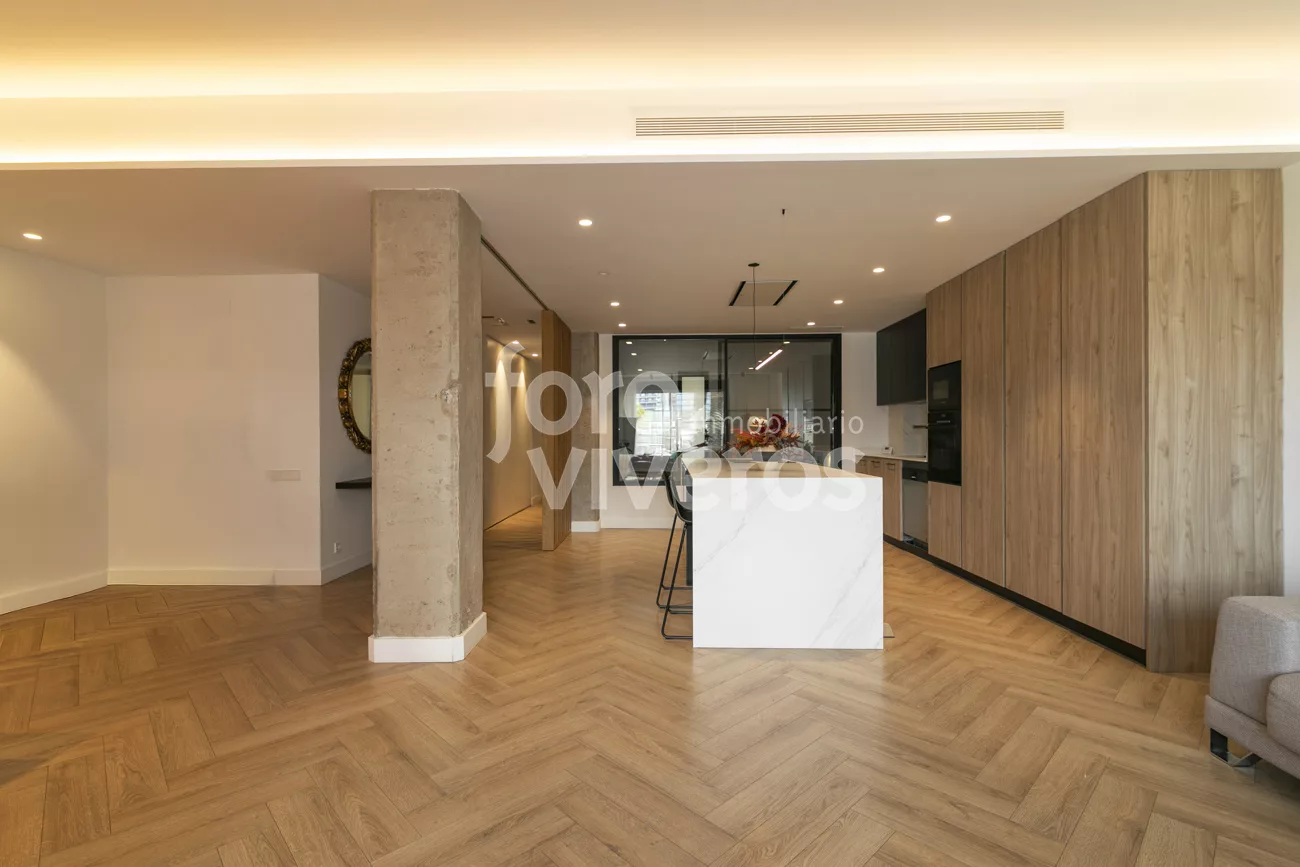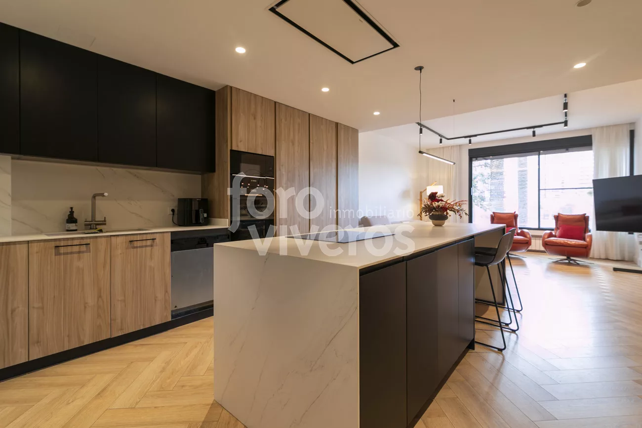 La zona de día se organiza en un espacio amplio y continuo donde se integran el salón-comedor, con un gran mirador sobre la Alameda, y la cocina con isla central y gran armariada.